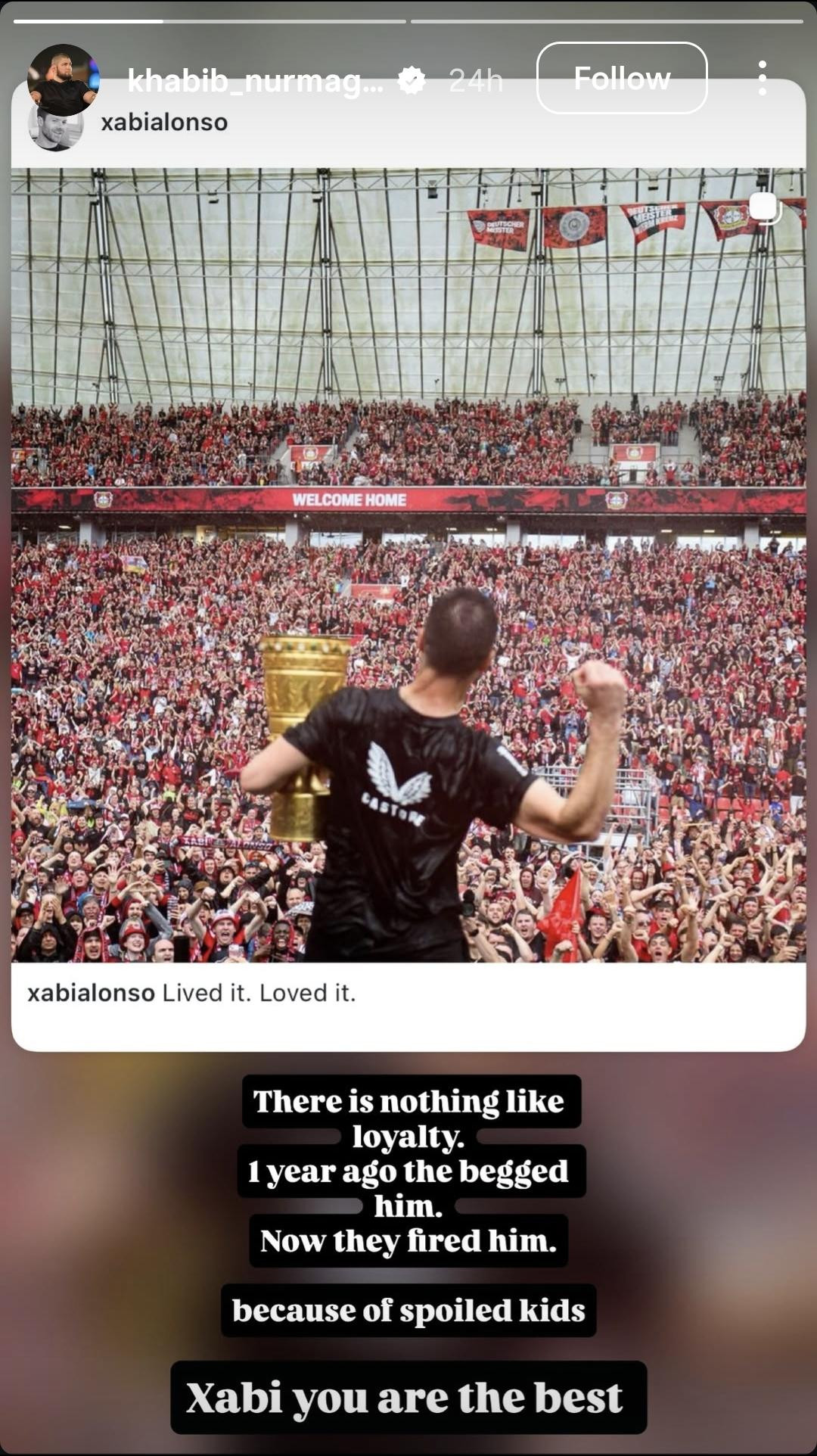 ‘‘Kad uđeš u dvoranu ili na teren, nije važno jesi li borac ili nogometaš – glavni trener je taj koji vodi momčad‘‘, napisao je Nurmagomedov na Instagram Storyju na ruskom jeziku (prijevod prenosi Seputar Real Madrid). ‘‘Ali ako atmosfera u momčadi ne dopušta svima da slijede tvoje upute, onda je jasno da nešto ne štima. Vjerujem da je Alonso među tri najbolja trenera modernog nogometa. Ako momčad ne može raditi s njim, onda se moraju mijenjati igrači, a ne trener. Uvjeren sam da se nijedan trener ne bi mogao nositi s ovakvom svlačionicom u Madridu. Treba se riješiti nestalnih i nekonzistentnih igrača.‘‘