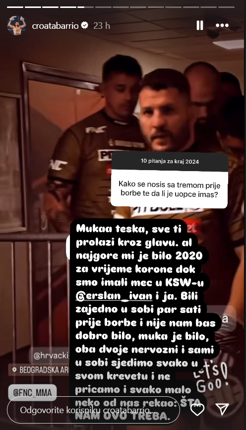 "Muka teška, sve ti prolazi kroz glavu, ali najgore je bilo 2020. godine za vrijeme korone, dok smo Ivan Erslan i ja imali meč u KSW-u. Bili smo zajedno u sobi par sati prije borbe i nije nam baš dobro bilo. Osjećali smo mučninu, bili smo nervozni i sami smo sjedili u sobi, svako na svom krevetu. Nismo pričali, samo bi svako malo netko od nas dvojice rekao: ‘ŠTA NAM OVO TREBA‘", otkrio je iskreni Barrio.