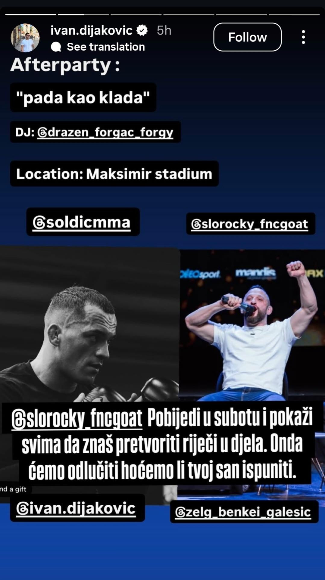 ‘‘Afterparty: Pada kao klada, DJ je Dražen Forgač, a lokacija je Maksimirski stadion. SloRocky, pobijedi u subotu i pokaži svima da znaš pretvoriti riječi u djela. Onda ćemo odlučiti hoćemo li tvoj san ispuniti.‘‘
