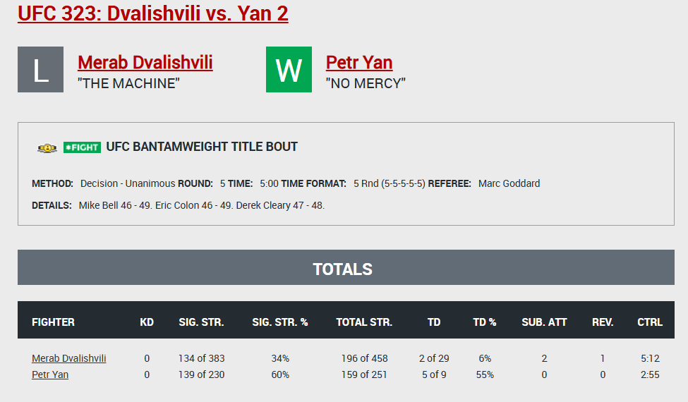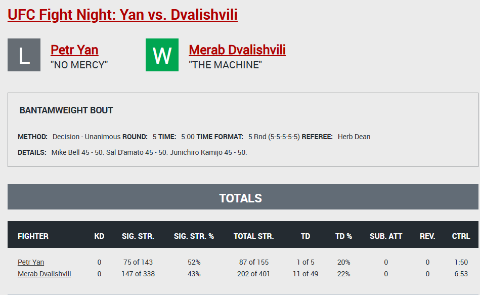 Statistika tog meča izgledala je nevjerojatno. Merab je pogodio gotovo duplo više značajnih udaraca (147-75), a gledajući ukupne udarce, razlika je bila još drastičnija. Dvališvili je ukupno pogodio 202 udarca, a Jan se zaustavio na 87. Merab ih je plasirao čak 401 dok je Jan bio znatno manje frekventan sa 155 pokušaja da pogodi Meraba.