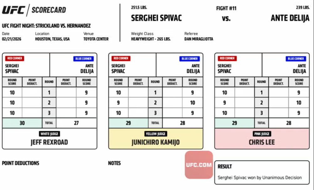 Meč između njega i Spivaka održao se rano jutros na UFC-ovom eventu u Houstonu, a Delija se zaista pridržavao taktike. Veliki dio borbe odvijao se upravo na sredini kaveza, gledali smo razmjene na nogama, a Spivak je upisao tek jedno rušenje i ostvario je nešto manje od dvije minute kontrole.