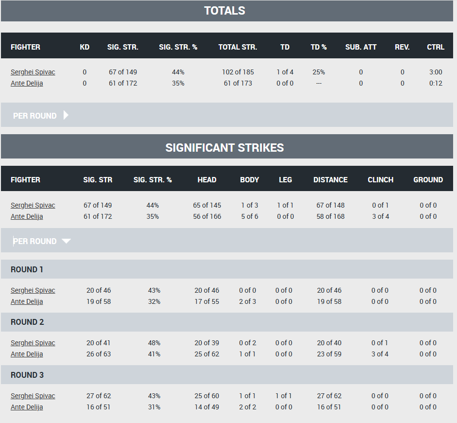 Ako popratimo statistiku po rundama, Spivak je u prvoj rundi pogodio tek jedan značajan udarac više od Delija i bila je to zapravo poprilično tijesna runda, ali jednoglasno je otišla na stranu Moldavca. U drugoj rundi Delija je preuzeo konce u svoje ruke, nadjačao je Spivaka, nanosio je više štete, blago ga je i uzdrmao, a učestalije je i pogađao (26-20 značajni udarci).