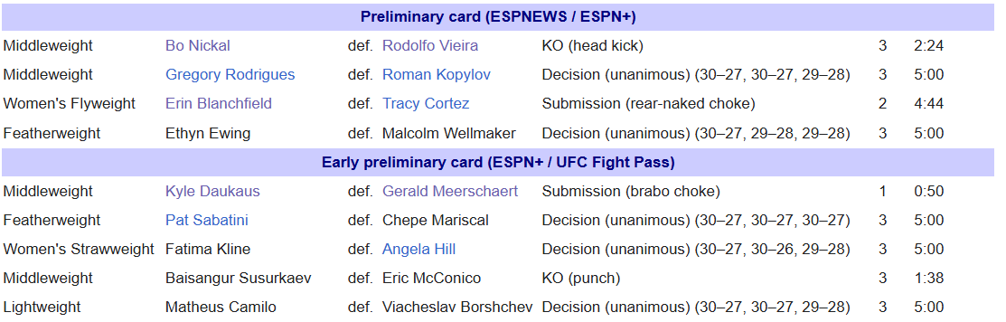 Preliminarni dio eventa zatvorili su Bo Nickal i Rodolfo Vieira. Jedan je ušao u MMA s reputacijom vrhunskog hrvača (Nickal), a drugi je napravio tranziciju iz BJJ-a. Mnogi su bili uvjereni kako je ovo uparivanje stilski jako pogodno po Nickala. Rodolfo Vieira hrvački teško može ugroziti Nickala, a ukoliko borbu ne uspije odvesti u parter, bit će u deficitu.